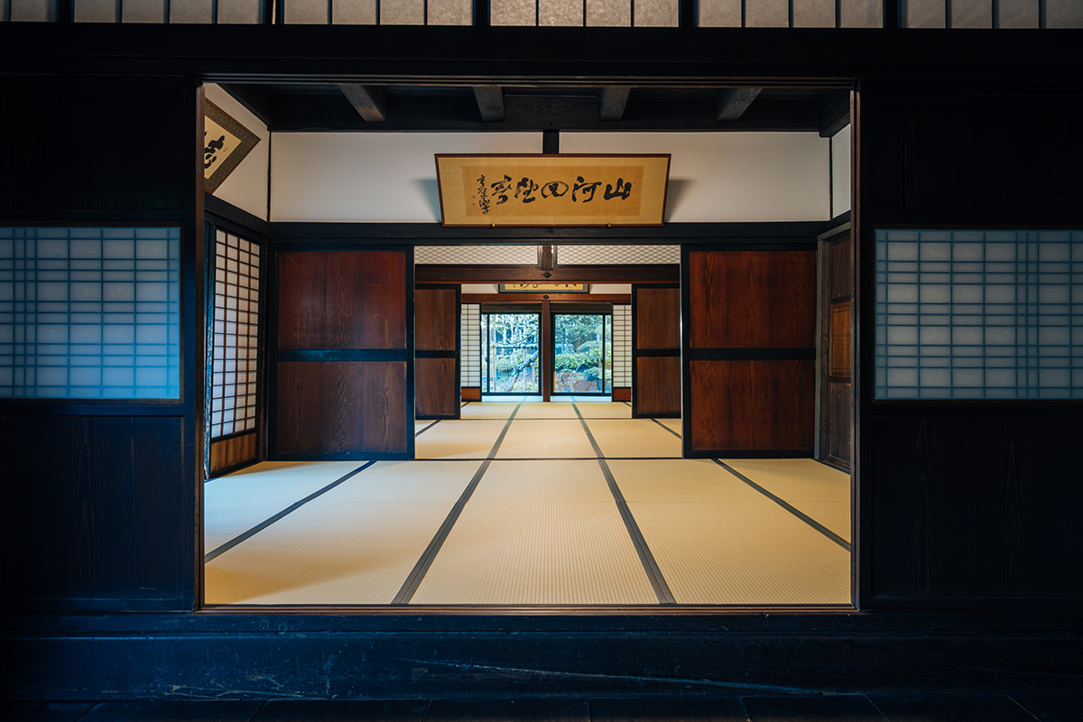玄関を入ると左手には三間続きの和室が開けます。 10畳の和室3室と1間の縁側が並び、4組の引き戸のレイヤーと、畳の縁が一点凝視法を強調する景色は圧巻です。さらに新たなしっくい壁と障子の白と柱とのコントラストが、よりビビッドに空間へのメリハリを与えます。
